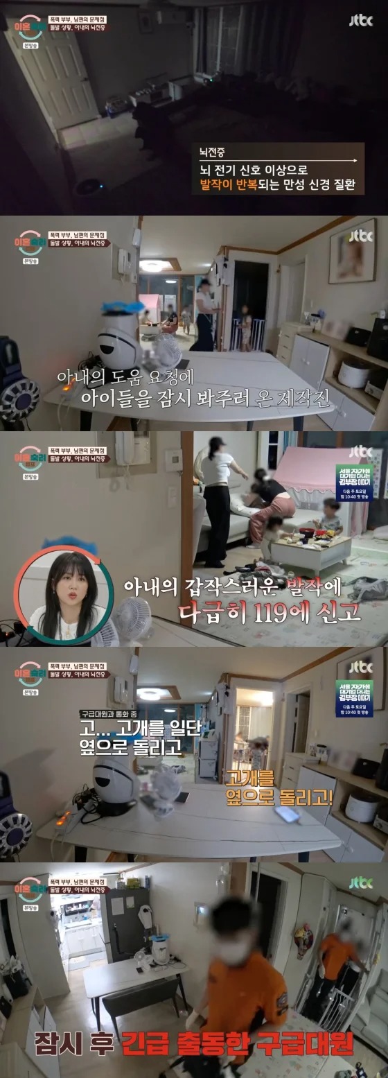 방송에 따르면 16기 부부의 아내는 어릴 적부터 난치성 뇌전증을 앓고 있었고, 잦은 발작으로 일상생활이 쉽지 않은 상황이었습니다. 이날도 집안에 설치된 관찰 카메라 앞에서 증상이 발현되며 긴급한 상황이 벌어졌습니다. 남편이 부재중이던 상황에서 아내는 제작진에게 도움을 요청했고, 현장은 순식간에 긴장감에 휩싸였습니다.